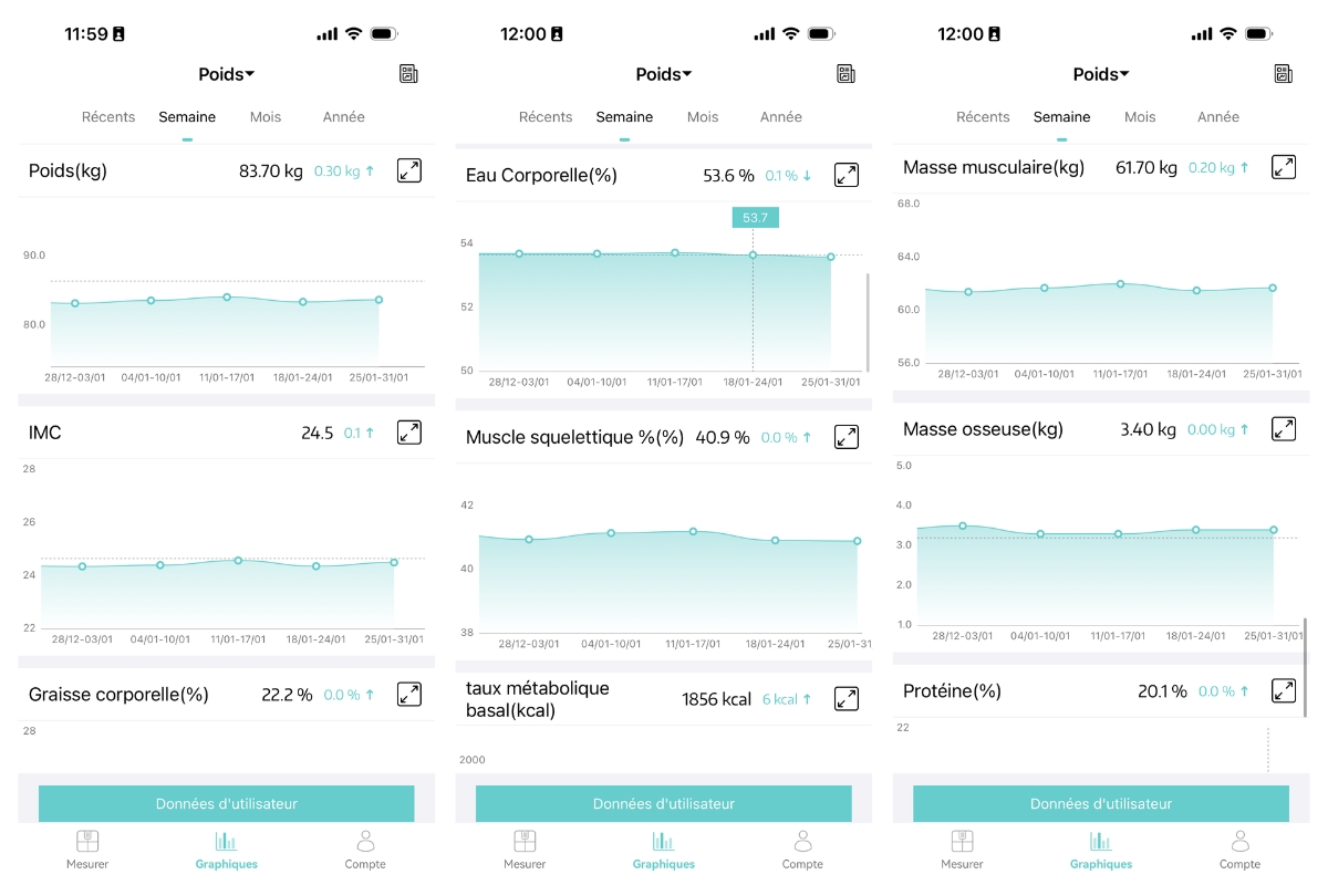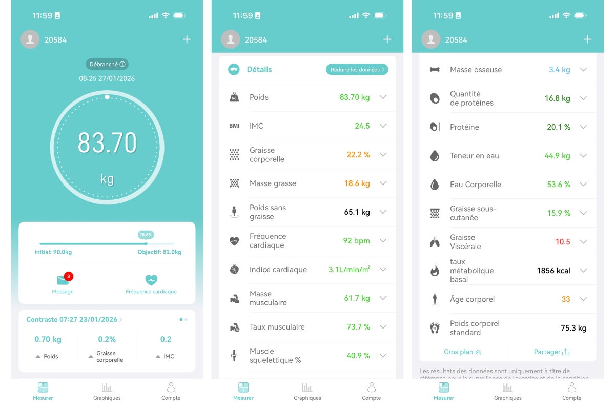 Pour aller plus loin, vous devez ensuite consulter l’application, qui affiche un ensemble de données beaucoup plus complet. On y retrouve le poids et l’IMC, mais aussi la graisse corporelle en kilogrammes et en pourcentage, le poids sans graisse, la fréquence cardiaque et l’indice cardiaque, la masse musculaire en kg et en %, la masse osseuse en kg, la quantité de protéines en kg et en %, la teneur en eau, la graisse sous-cutanée, la graisse viscérale, le métabolisme de base, l’âge corporel ainsi que le poids corporel standard.