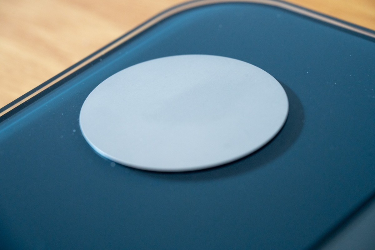 Sur la surface supérieure, on retrouve quatre électrodes métalliques, qui servent à mesurer la composition corporelle par impédancemétrie. La balance reste bien en place lors de la pesée et ne glisse pas, ce qui me paraît très important pour obtenir des mesures cohérentes dans le temps.