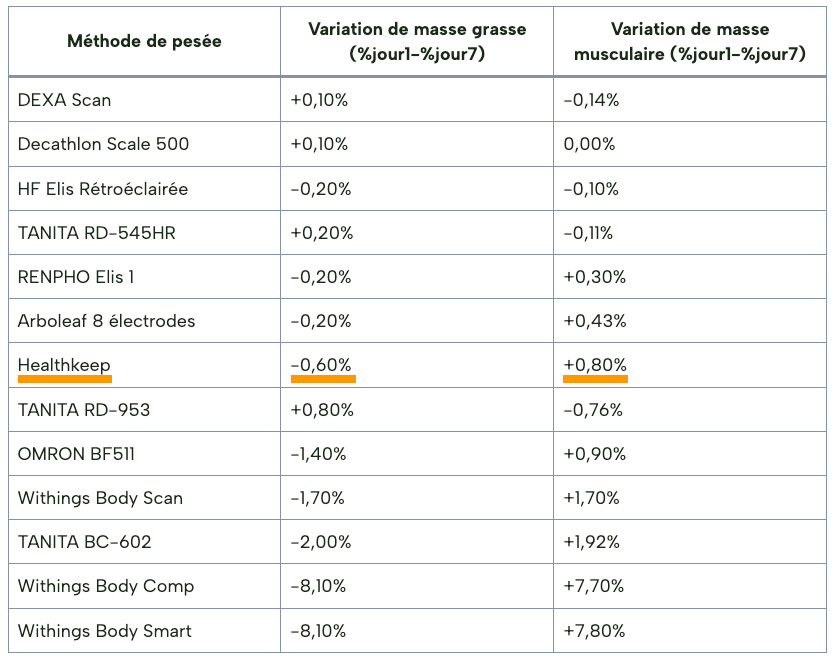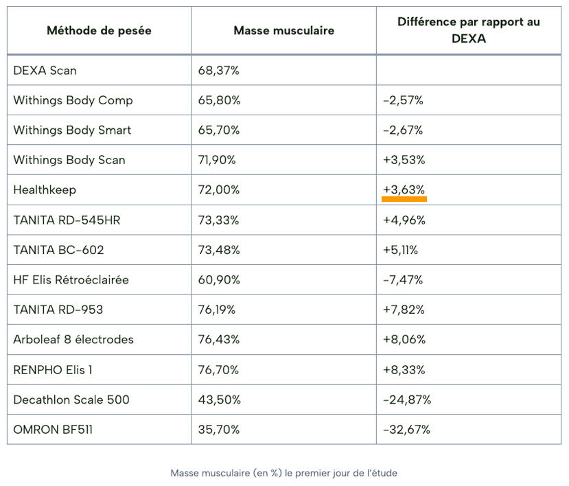 Pour cette étude, j’ai testé chaque balance dans des conditions identiques sur plusieurs jours, puis comparé leurs résultats à ceux d’un DEXA scan, utilisé comme référence pour la masse grasse et la masse musculaire.