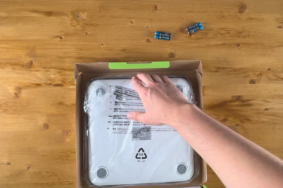 Le déballage est simple et rapide. La boîte s’ouvre facilement et contient la balance Healthkeep, un manuel d’utilisation et 4 piles AAA.